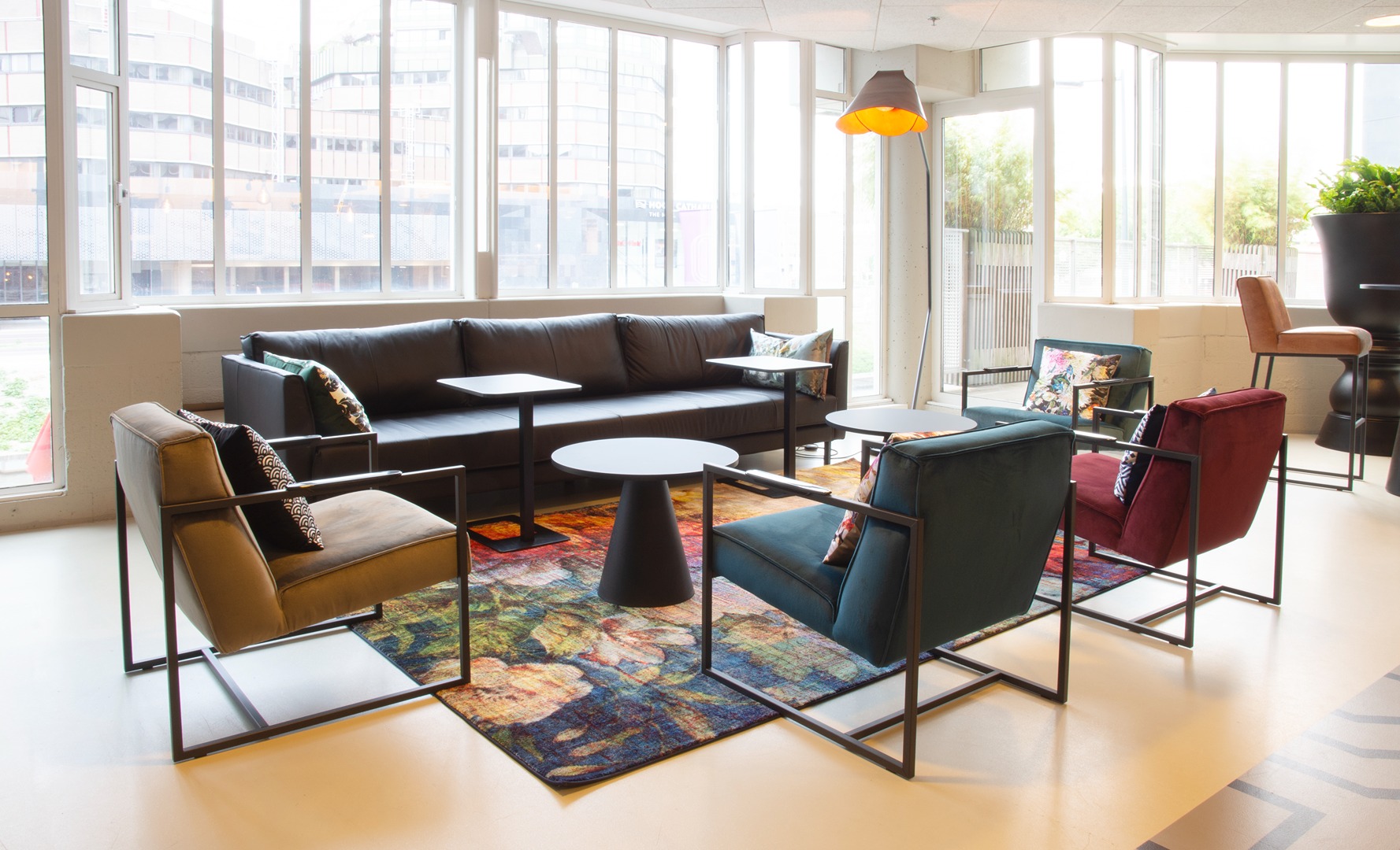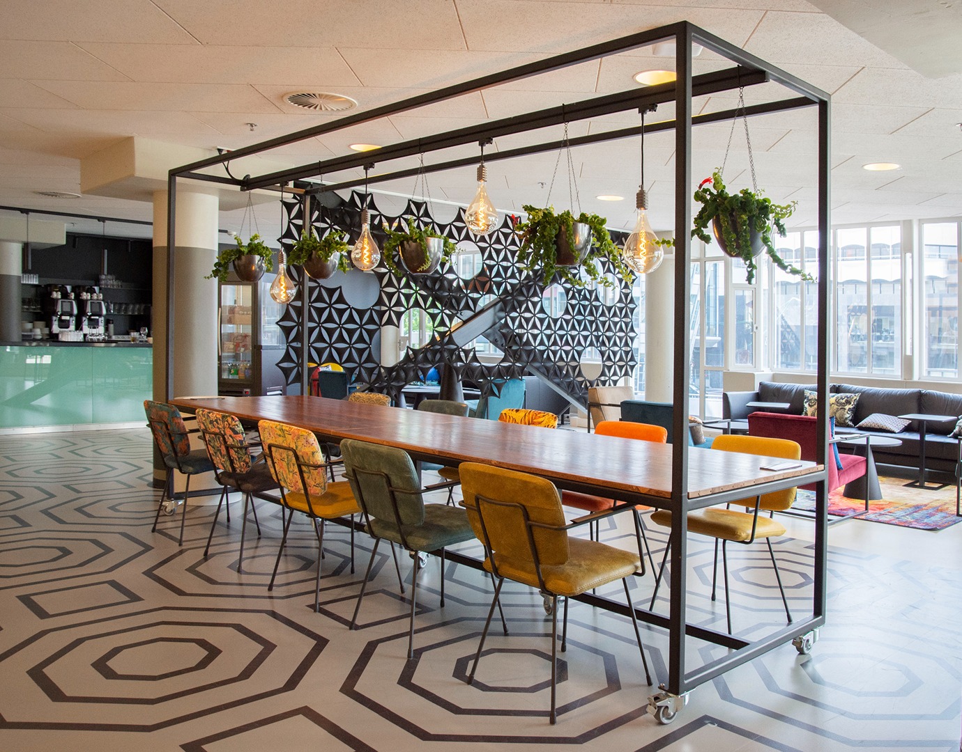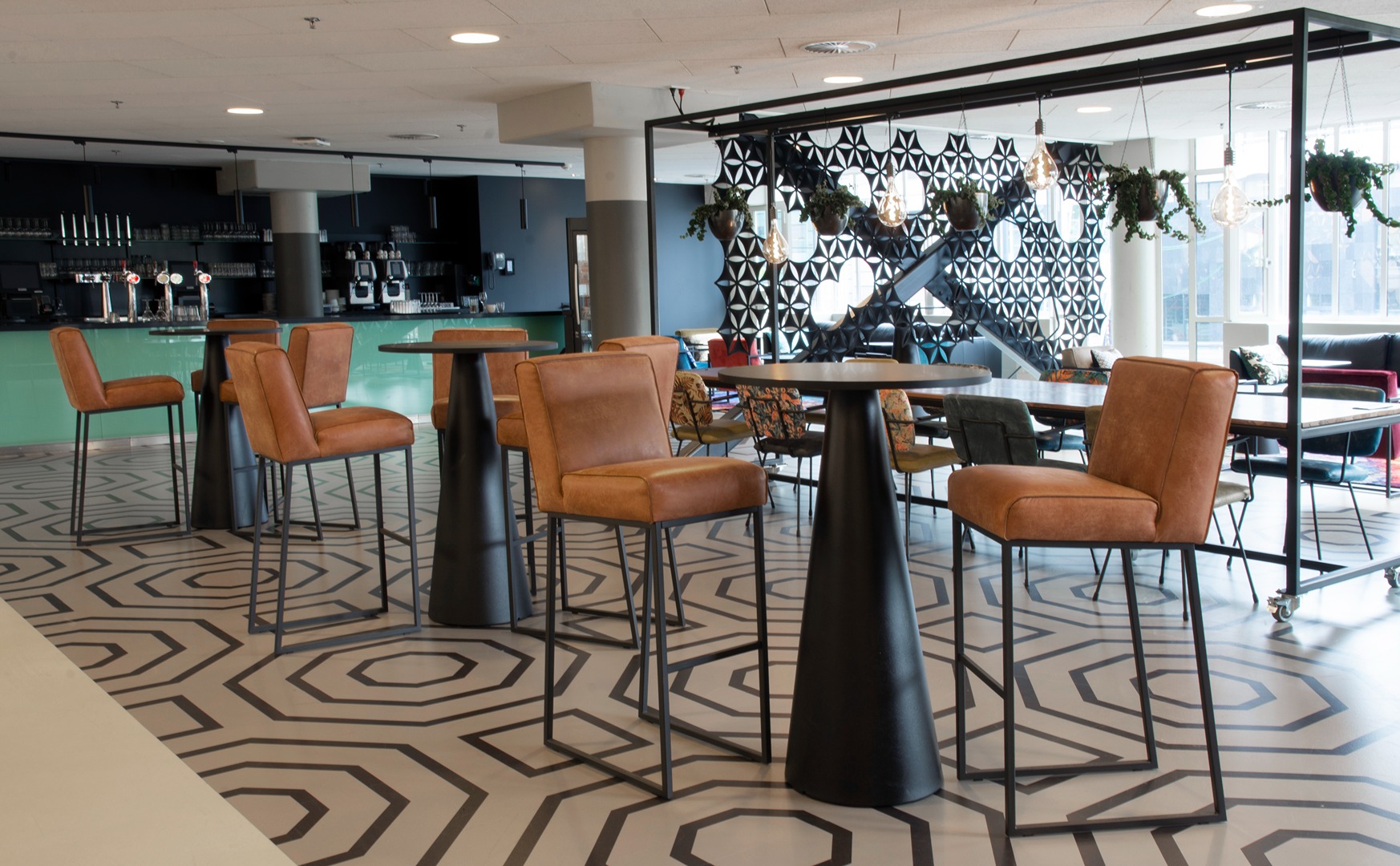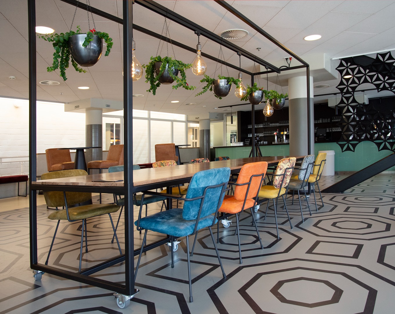 The table with hanging plants belongs to the Het Anker specialty assortment – a custom-made table that is mobile and easy to dismantle. Het Anker’s manufacturing expertise and extensive network allows them to supply specials like this in addition to their extensive collection of seating. Other items selected for the TivoloVredenburg project included Barbi armchairs, Lara bar stools, Mocca dining chairs, and Malbec sofas.