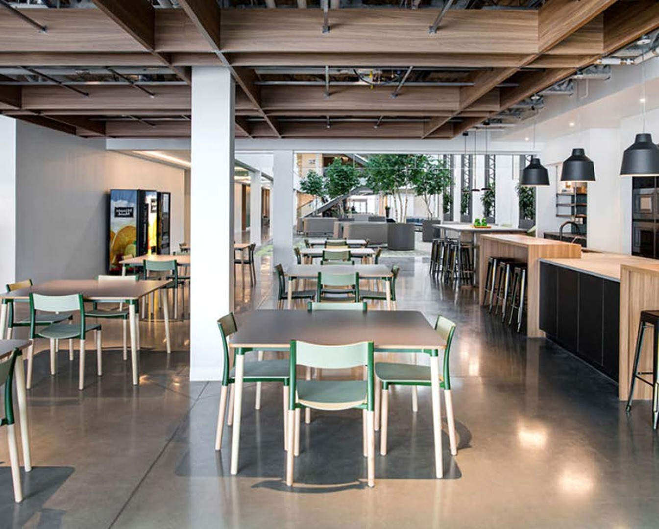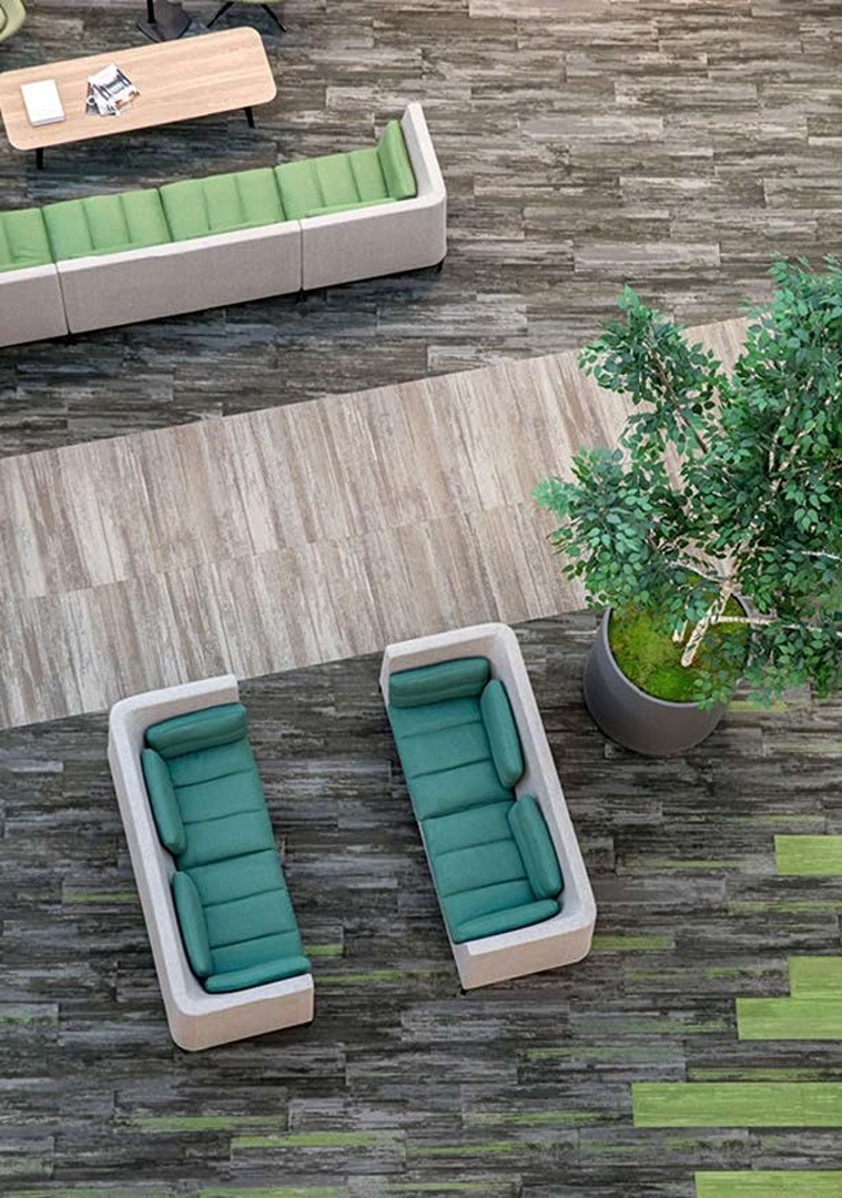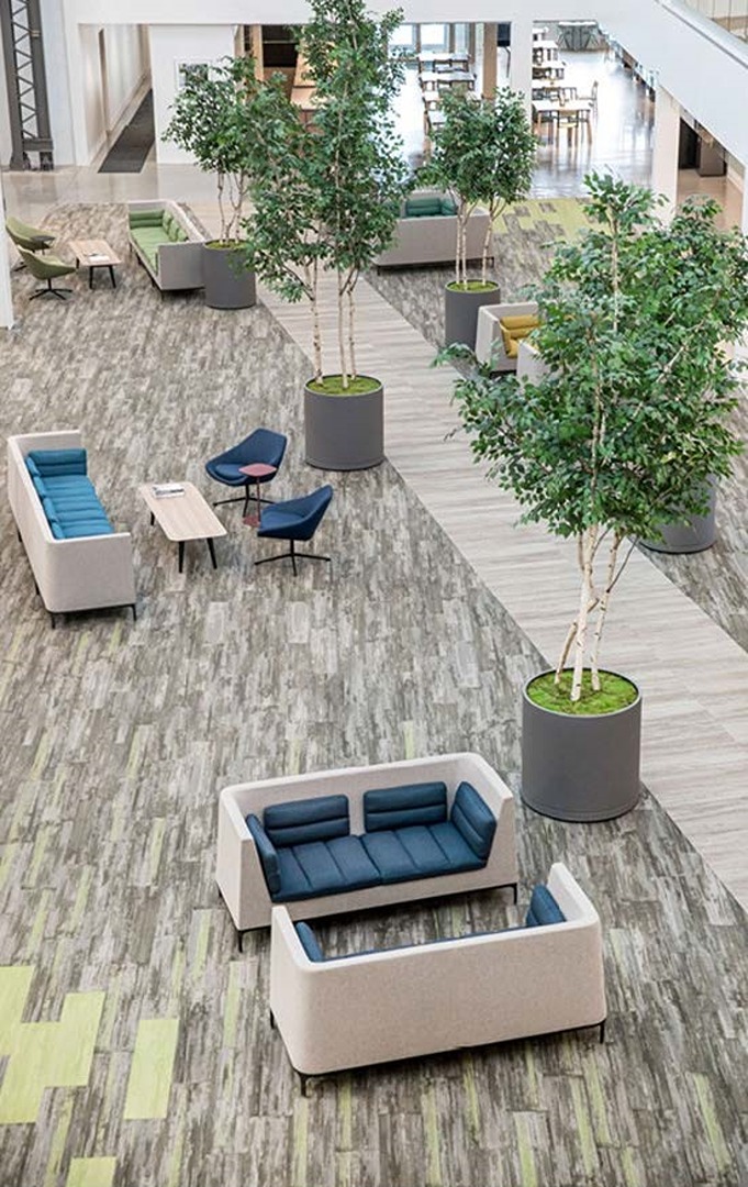 The prairies, foothills, lakes, and mountains were interpreted in the design using individual colour and materials palettes – one for each of the four floors of the building. These different but complementary palettes define the spaces and act as wayfinding on the large floor plates. The main atrium area was designed to act as a community park and conduit within the space, with a pathway from one end to the other and areas to meet, relax and collaborate on either side.